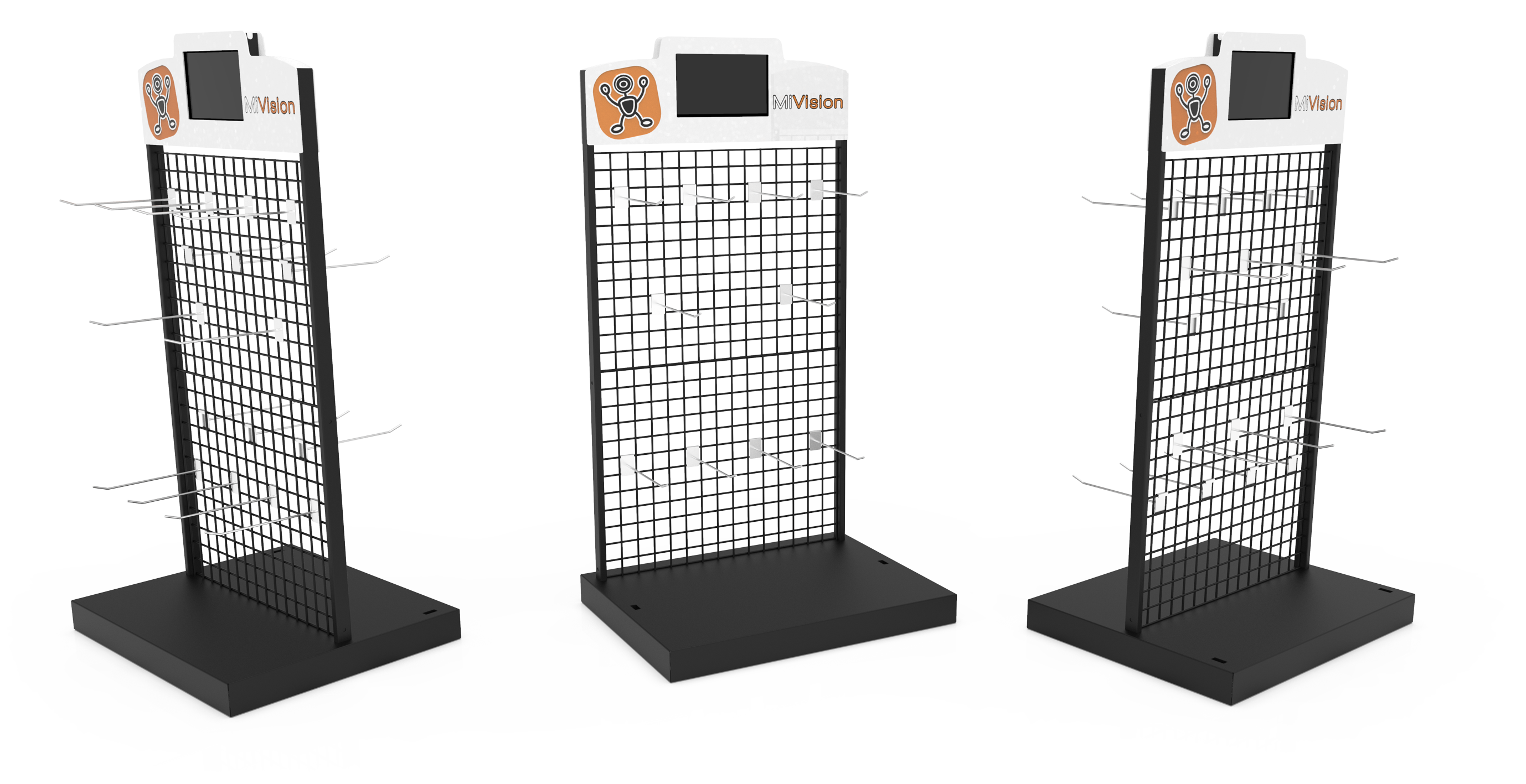 Flat pack sheet metal display stand for 1-side or 2-sided product display. Setup configured to incorporate 12†display.